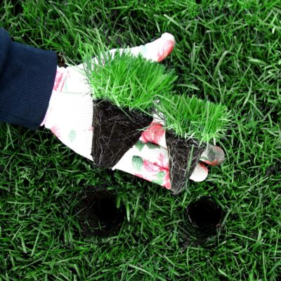 Wkładamy V Grass System do dołka w murawie i udeptujemy.
